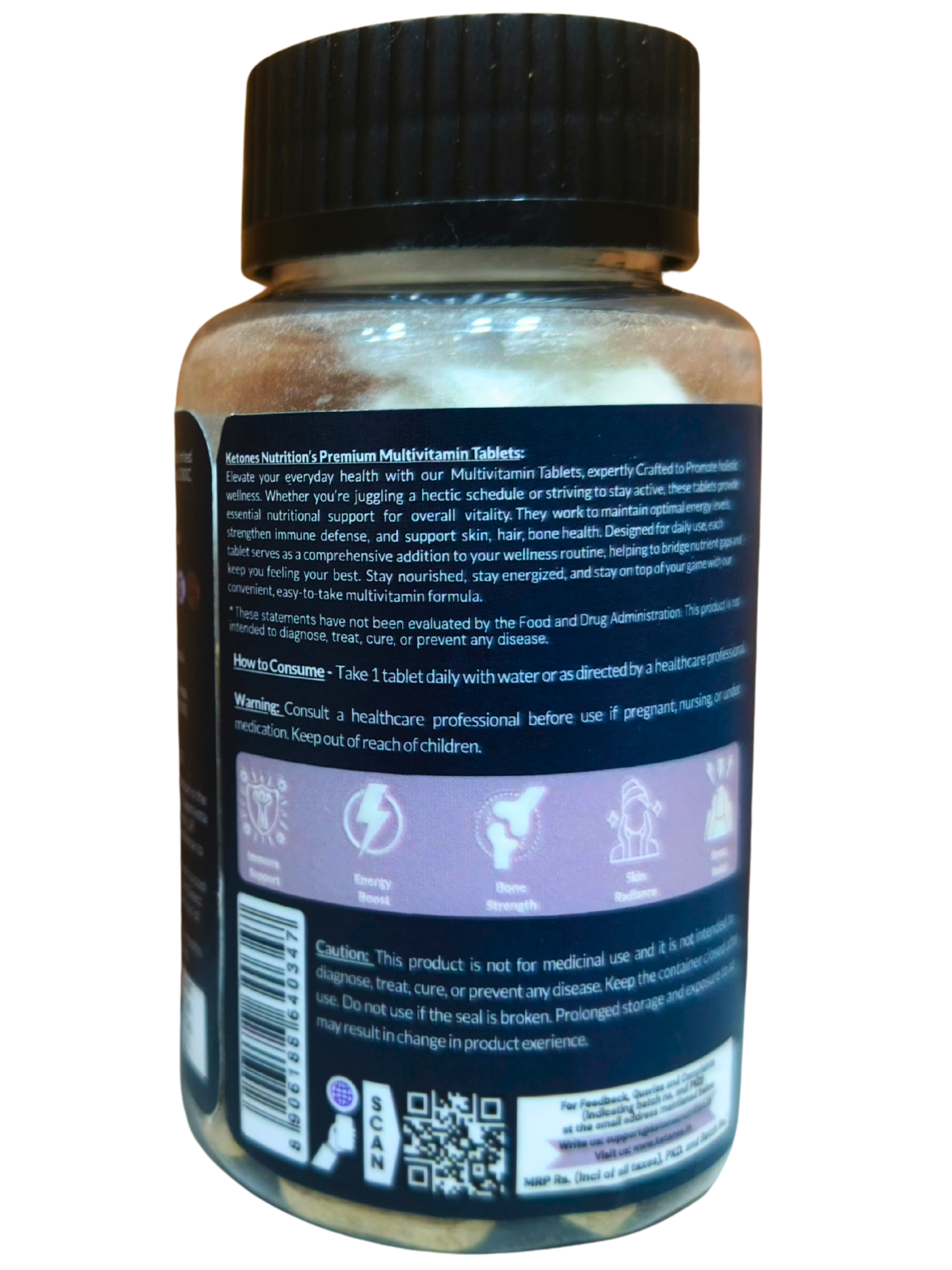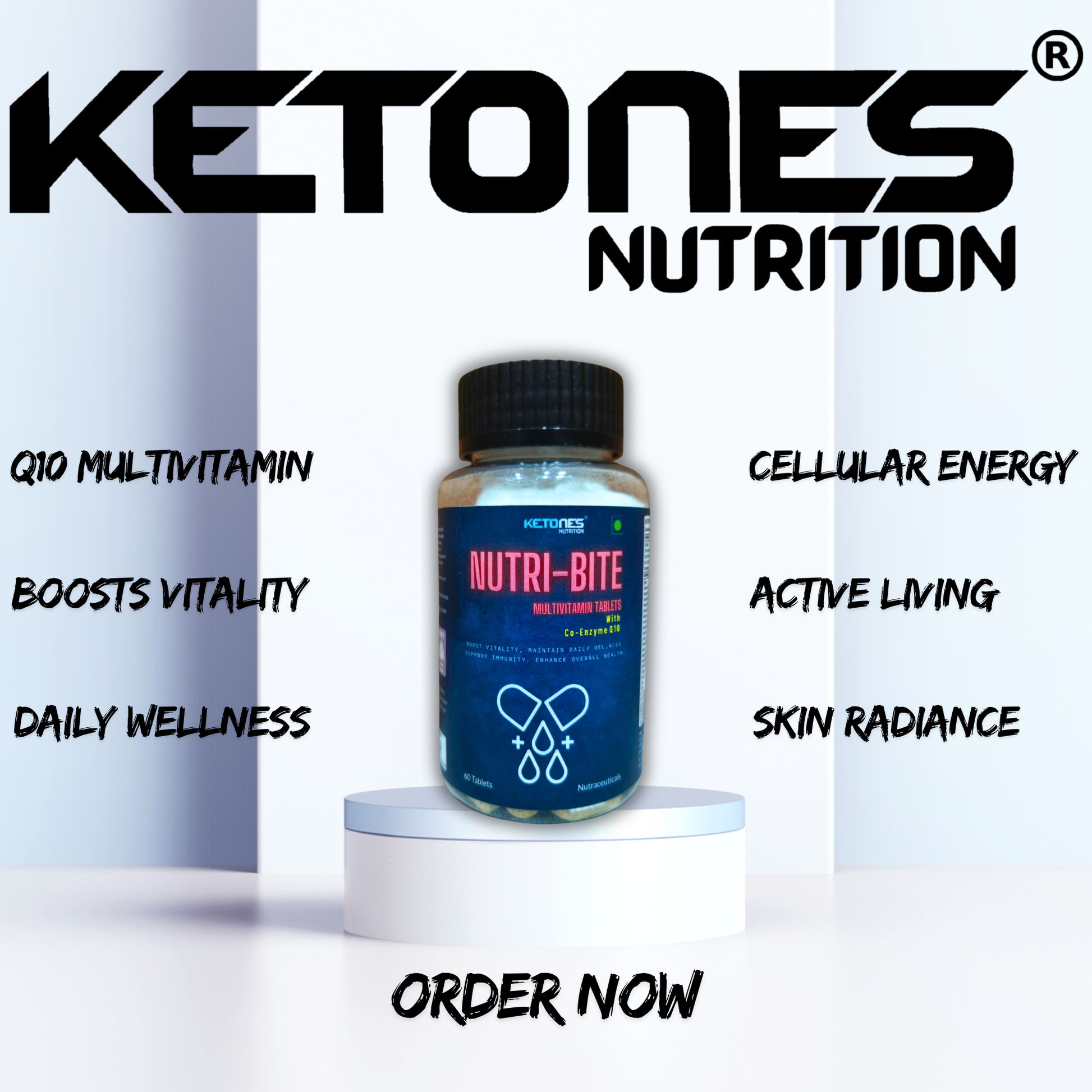 Boost your daily health with Ketones Nutrition Nutribite Multivitamin Tablets, a scientifically formulated blend of essential vitamins, minerals, Co-Enzyme Q10, L-Lysine, and probiotics designed to support energy, immunity, heart health, and overall wellness.